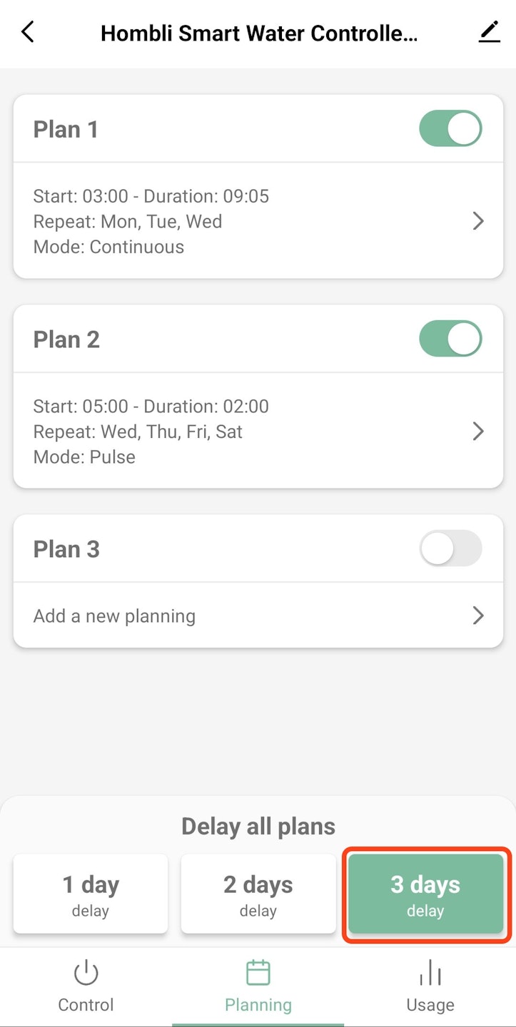 Binnen de Hombli app kunt u de irrigatietijden van uw Water Controller plannen. Na een regenachtige dag hoeven je planten niet opnieuw water gegeven te worden. In de app kun je eenvoudig alle programma’s voor een bepaald aantal dagen opzeggen. Na deze periode worden ze automatisch hervat.