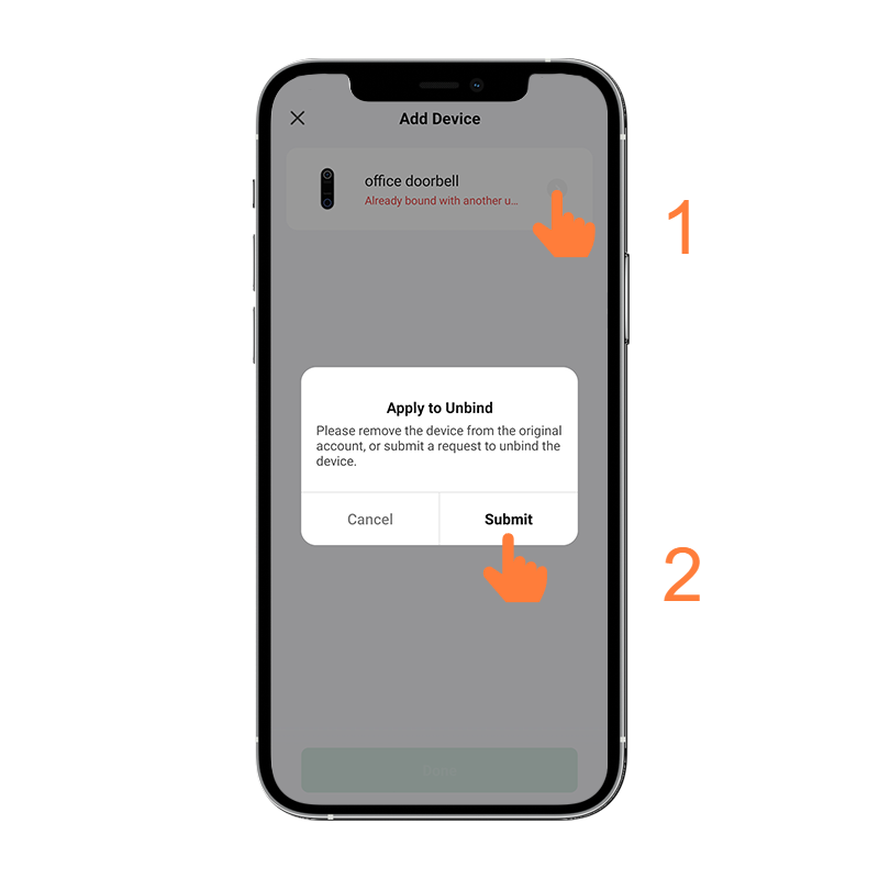 Op het scherm met de melding dat de deurbel of camera al aan een ander gebruikersaccount is toegevoegd, tik je op de grijze pijl.